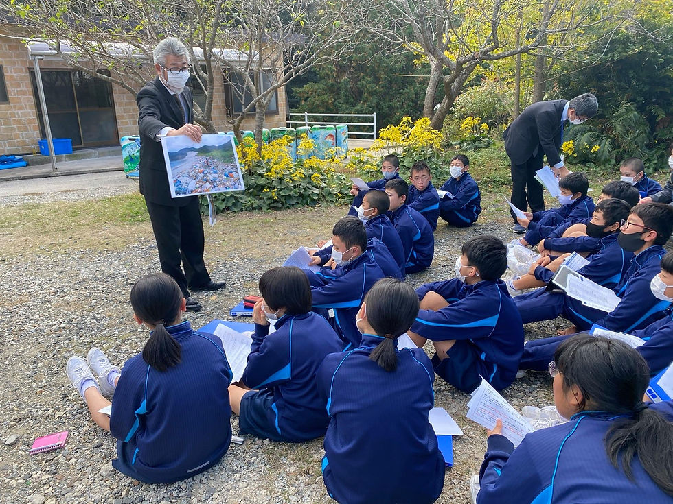 今回新型コロナ感染防止のため外で対馬の海ごみについて授業を行いました。晴天に恵まれた青空教室でした。